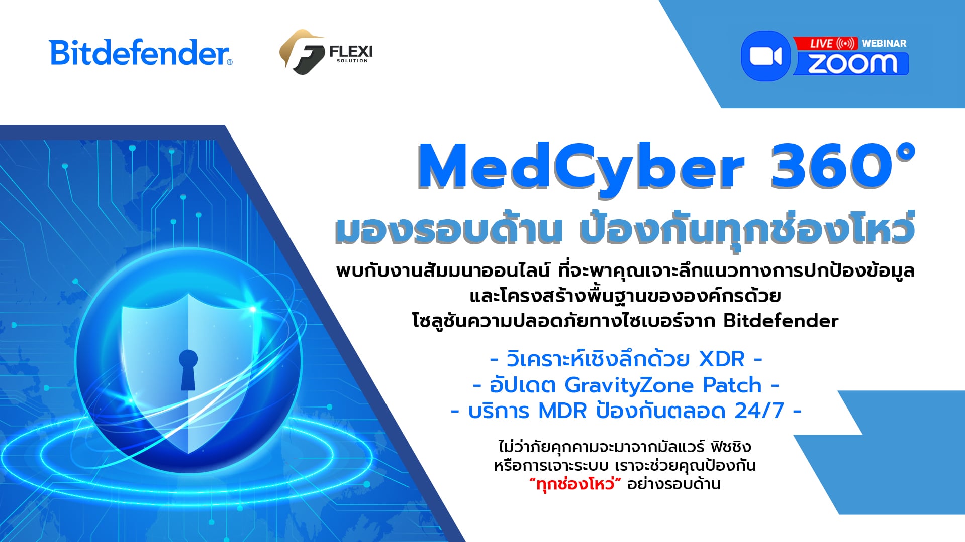 MedCyber 360° – มองรอบด้าน ป้องกันทุกช่องโหว่! ร่วมสัมมนาออนไลน์พิเศษจาก Bitdefender และ Flexi Solution ที่จะพาคุณลึกแนวทางการปกป้องข้อมูล และโครงสร้างพื้นฐานองค์กร ด้วยโซลูชันความปลอดภัยทางไซเบอร์ครบวงจร