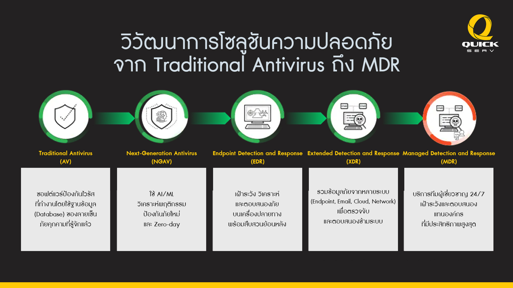 QuickServ พร้อมให้คำปรึกษาและติดตั้งโซลูชันความปลอดภัยไซเบอร์ครบวงจร ตั้งแต่ Antivirus พื้นฐานจนถึง MDR ขั้นสูง เพื่อปกป้ององค์กรของคุณจากภัยไซเบอร์ทุกรูปแบบ