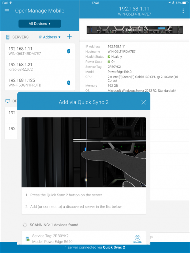 สิ่งที่ Dell ทำคะแนนได้เหนือกว่า HPE iLO 5 นั่นก็คือ คุณสมบัติของ Quick Sync 2 ซึ่งทำให้เราสามารถเชื่อมต่อ iPad ของเรากับเซิฟเวอร์ผ่าน Bluetooth โดย OpenManage Mobile (OMM) แอปพลิเคชั่น นี้ iOS ช่วยให้เราสามารถดูข้อมูลเซิฟเวอร์ การแจ้งเตือน และสถานะโดยรวมทั้งหมด รวมทั้งรีบูตเครื่องและควบคุมโดยใช้ VNC Viewer ซึ่งเป็นแอปฟรี ได้อีกด้วย