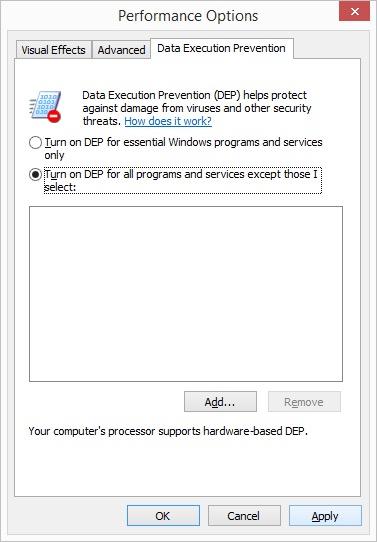 - เพื่อความแน่ใจ ให้ทำการตรวจสอบว่า ได้ทำการปิดการใช้งานในส่วนของฟีเจอร์ Data Execution Prevention (DEP) จากใน BIOS เรียบร้อยแล้ว ทำตามคู่มือเมนบอร์ดของคุณ หากคุณต้องการความช่วยเหลือ หากคุณยังพบปัญหาอยู่ ให้ใช้ Start Menu เพื่อค้นหา 'performance' หลังจากนั้นให้ทำเลือกทำรายการ Adjust the appearance and performance of Windows คลิกที่ปุ่ม Data Execution Prevention และเปิด Data Execution Prevention (DEP) สำหรับโปรแกรมและบริการทั้งหมด หลังจากนั้นให้ทำการปิดและเปิดเครื่องใหม่และลองทำซ้ำอีกครั้ง