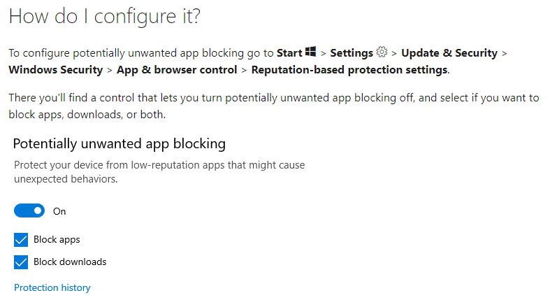 ก่อนหน้านี้ ผู้ใช้ Windows 10 ที่ต้องการเปิดใช้งานฟีเจอร์การบล็อก จะต้องไปเปิดใช้งานเองในการตั้งค่า App & browser control แต่เริ่มตั้งแต่ ‘ต้นเดือนสิงหาคม’ นี้  ฟีเจอร์ดังกล่าวจะถูกปรับให้เป็นค่าเริ่มต้นแทน