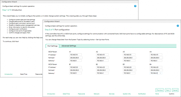 เป็นข่าวดี ที่คุณไม่จำเป็นจะต้องเป็นผู้เชี่ยวชาญด้านการจัดเก็บข้อมูล เพื่อปรับใช้ MSA 2052 กับงานของคุณ เนื่องจาก เว็บคอนโซลที่เรียบง่ายอย่าง SMU v3 จะเป็นตัวช่วยให้การเริ่มต้นเป็นไปอย่างรวดเร็วใน 9 ขั้นตอน ทั้งนี้ก็เพื่อเป็นการช่วยกำหนดค่าการเข้าถึงการจัดการ, การตั้งค่าระบบและการกำหนดพอร์ตข้อมูล จากระบบการรีวิวของเราซึ่งได้รับการจัดเตรียมสำหรับ Transceivers เต็มรูปแบบของ 10GbE SFP + iSCSI ดังนั้นเราจึงต้องมีการกำหนด IP Addresses แบบคงที่ให้กับแต่ละอัน