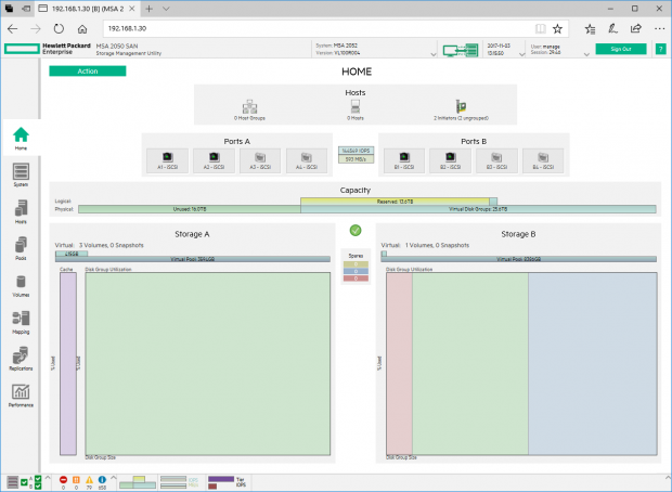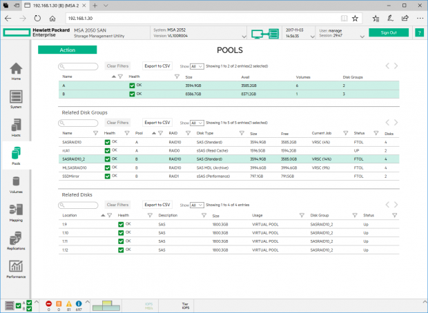 HPE ได้จัดเตรียมระบบทดสอบของเราไว้ด้วย 4 SSDs, 8 SAS ไดร์ฟ และ 12 Midline SAS ไดร์ฟ โดยที่เราได้ทำการสร้าง Pool ไว้สอง โดยแต่ละ Pool จะมีสามระดับ และทำการแม็พไดร์ฟ Virtual volumes ไปยังแต่ละโฮสต์