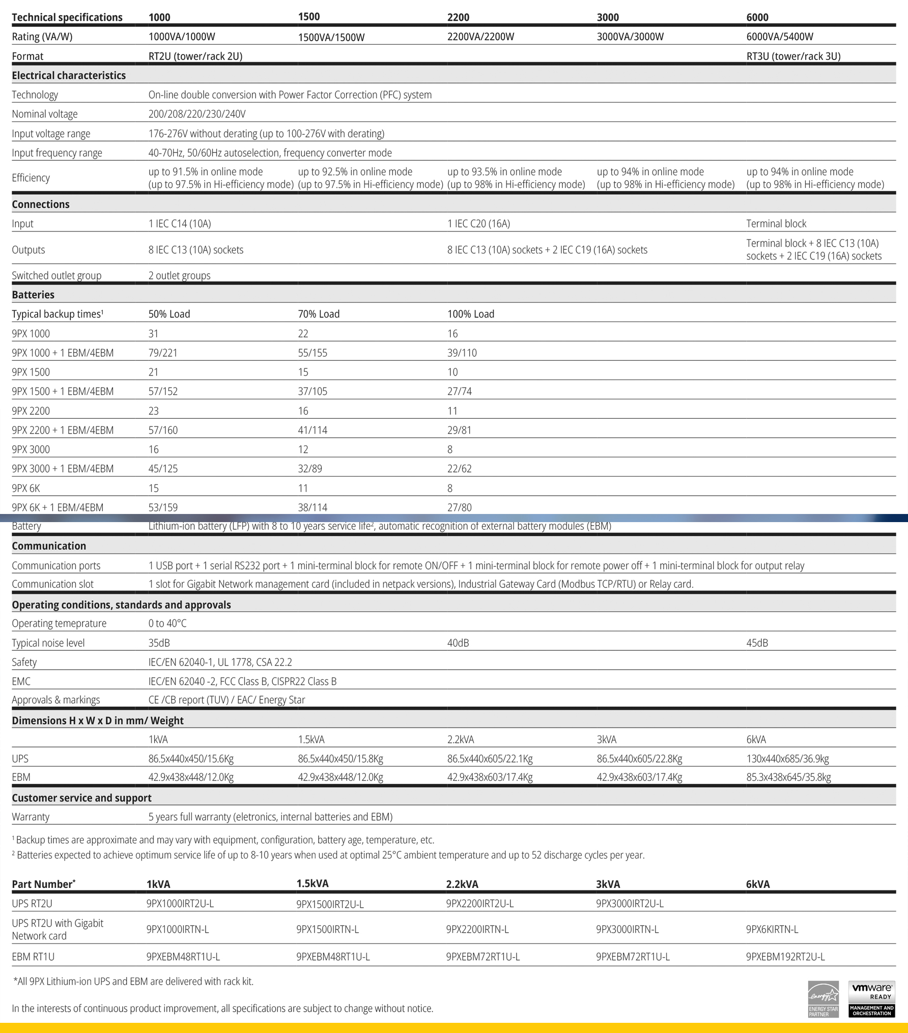 UPS ทุกรุ่นมาพร้อมอุปกรณ์ติดตั้งครบชุด พร้อมรองรับการเพิ่ม External Battery Module (EBM) ได้สูงสุดถึง 4 ชุด เพื่อขยายระยะเวลาสำรองไฟในกรณีเกิดเหตุฉุกเฉิน