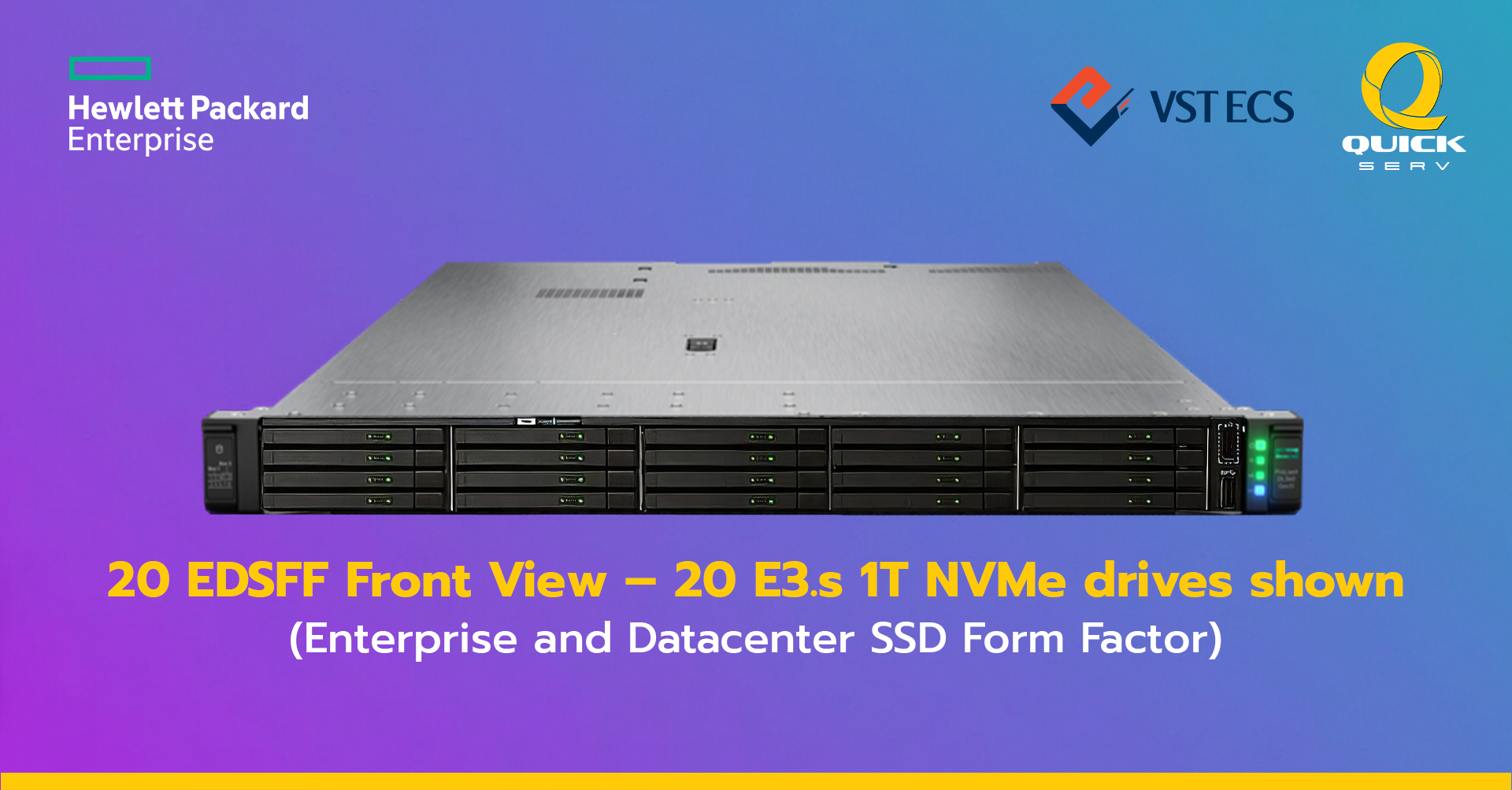 ระบบจัดเก็บข้อมูลที่ปรับแต่งได้ตามต้องการ DL360 Gen11 รองรับตัวเลือกการจัดเก็บข้อมูลที่หลากหลาย ทั้งแบบ 8+2 SFF, 4 LFF และที่โดดเด่นที่สุดคือการรองรับ NVMe EDSFF E3.S สูงสุด 20 ไดรฟ์ EDSFF (Enterprise and Datacenter SSD Form Factor) เป็นมาตรฐานใหม่ที่ออกแบบมาเพื่อตอบโจทย์ด้านประสิทธิภาพและความจุโดยเฉพาะ ให้ความเร็วในการอ่าน/เขียนสูงกว่า SSD แบบ 2.5" ทั่วไปถึง 4 เท่า